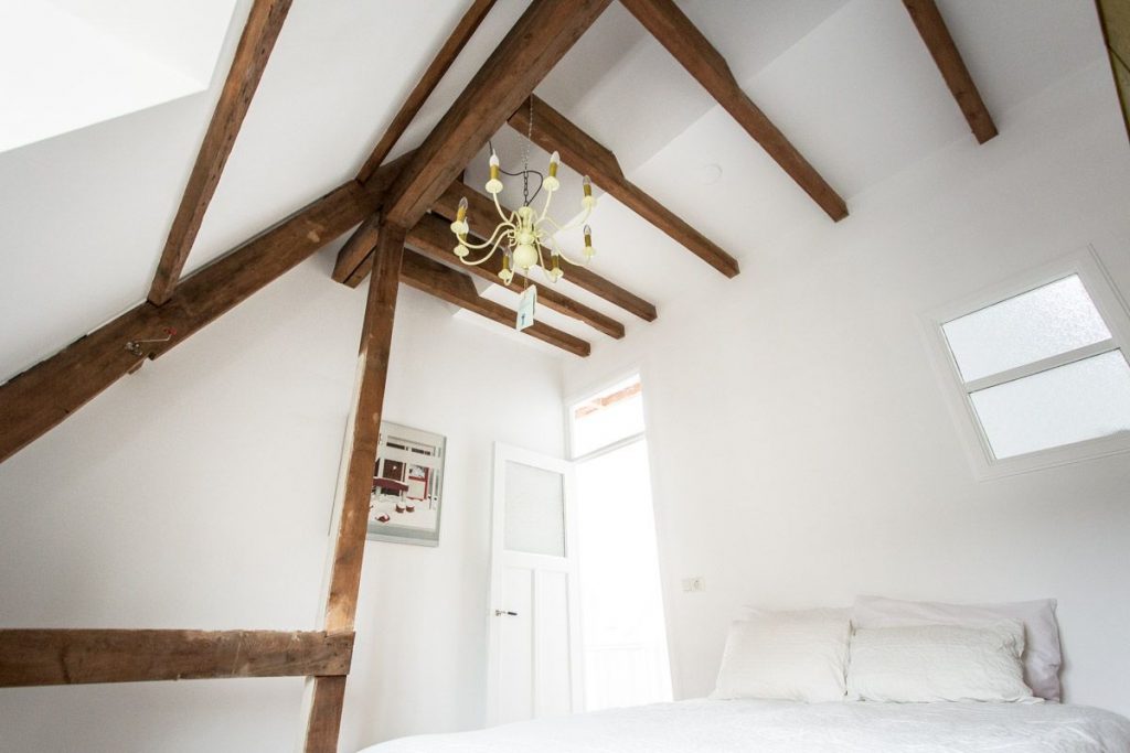 Na een fikse verbouwing op deze zolderverdieping moest alles geschilderd worden. De pandeigenaren wilden de houten elementen zichtbaar houden. Daarom is gekozen om de balkenconstructie ongeschilderd te laten. Dat betekent niet dat hier niks mee gedaan hoeft te worden; een grondige reiniging was hier wel op zijn plek. Daarnaast waren er ook een aantal binnendeuren die ongeschilderd dienden te blijven. De rest is witgeschilderd.